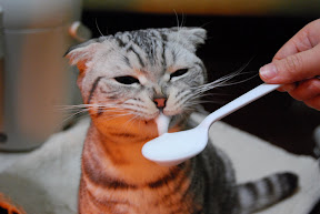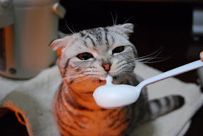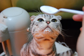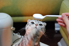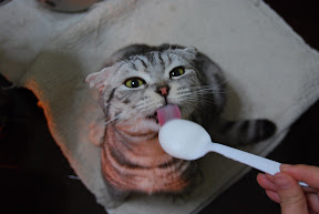 This could be the last time we gave Mano milk. Just the day after these pictures taken, we went to a vet, who confirmed that Mano has Osteochondrodysplasia , a genetic disease for Scottish Fold Cat ( or a breed from which). Mano can not have too much Calcium, and more, we need to control his weight in order to lessen the pressure to his limbs and toes.